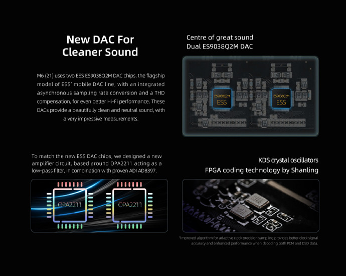 The DAC is advertised for a DNR of up to 128dB and THD of -120dB, and it can handle up to 32-Bit 768kHz PCM, DSD256 via DoP, and native DSD512. For amp and LPF, Shanling uses a new setup of OPA2211 combined with ADI AD8397 chips and the KDS crystal oscillators, helped by the new FPGA chip, to guarantee a bit-perfect playback.